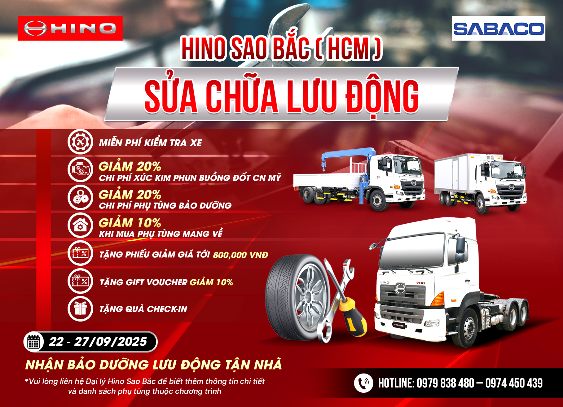 Để được tư vấn, hỗ trợ dịch vụ hoặc cập nhật sớm nhất lịch trình sửa chữa lưu động Hino trong thời gian tới, vui lòng liên hệ Hotline: 0979 838 480 – 0974 450 439.