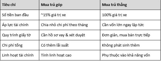 Thay vì phải thanh toán toàn bộ chi phí một lần, bạn chỉ cần trả trước khoảng 15% giá trị xe, phần còn lại sẽ được ngân hàng hoặc tổ chức tài chính hỗ trợ. Điều này giúp bạn: